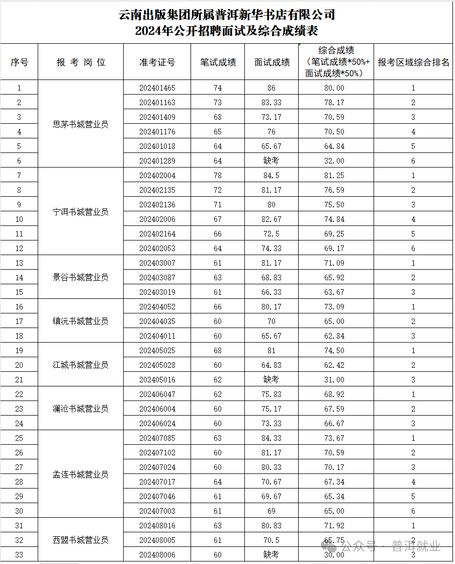 云南出版集團(tuán)所屬 普洱新華書店有限公司 2024年公開招聘面試及綜合成績公示 根據(jù)《云南出版集團(tuán)所屬普洱新華書店有限公司2024年公開招聘工作人員公告》的相關(guān)要求,現(xiàn)將云南出版集團(tuán)所屬普洱新華書店有限公司2024年公開招聘面試及綜合成績公示如下。