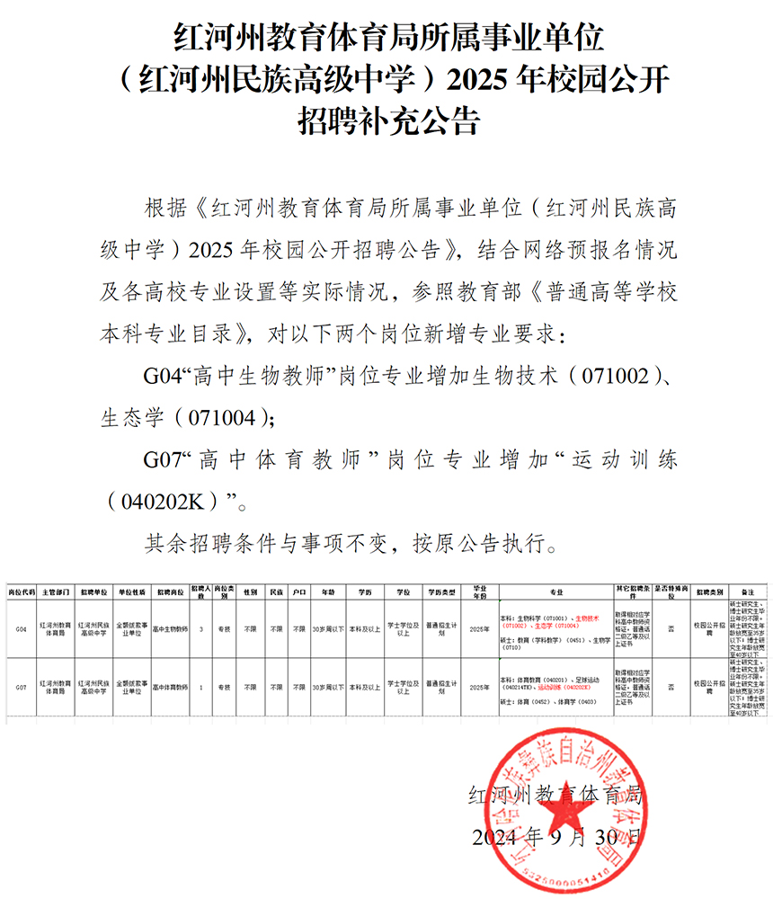 下載查看補(bǔ)充公告:紅河州教育體育局所屬事業(yè)單位(紅河州民族高級中學(xué))2025年校園公開招聘補(bǔ)充公告.docx