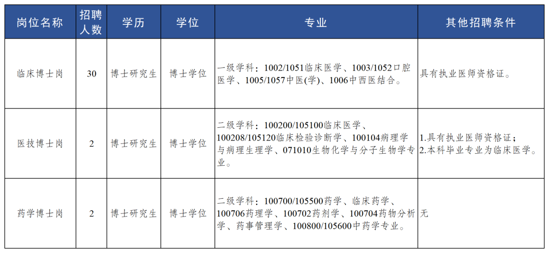 博士崗(34人):面向一級學科的臨床醫(yī)學、口腔醫(yī)學、中醫(yī)(學)、中西醫(yī)結(jié)合相關(guān)專業(yè)招聘臨床醫(yī)師30人;面向二級學科的臨床醫(yī)學、臨床檢驗診斷學、病理學與病理生理學、生物化學與分子生物學專業(yè)招聘臨床醫(yī)技2人,面向藥學相關(guān)專業(yè)招聘藥師2人。具體崗位要求如下: