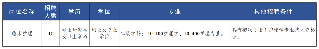 臨床護理(10人):面向護理(學)專業(yè)的碩士及以上畢業(yè)生招聘護理人員10人。具體崗位要求如下: