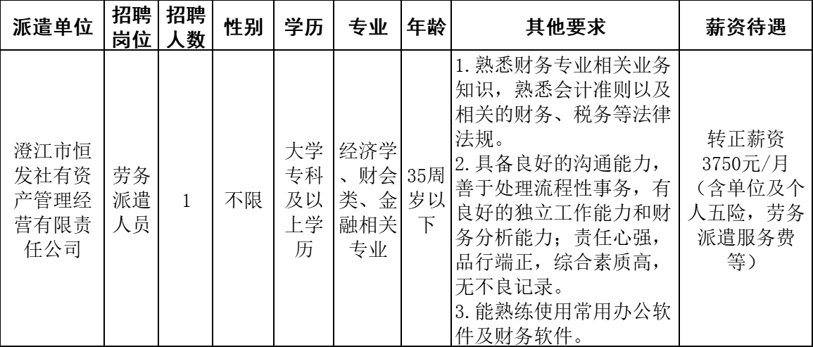 澄江市恒發(fā)社有資產(chǎn)管理經(jīng)營(yíng)有限責(zé)任公司因工作需要,委托澄江市啟澄人力資源有限責(zé)任公司派遣工作人員1名,有關(guān)要求如下: