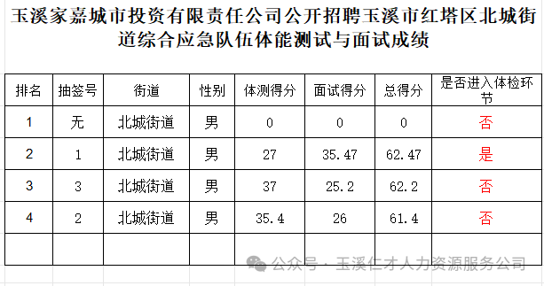 附件:玉溪家嘉城市投資有限責(zé)任公司公開招聘玉溪市紅塔區(qū)北城街道綜合應(yīng)急隊(duì)伍體能測(cè)試與面試成績(jī)