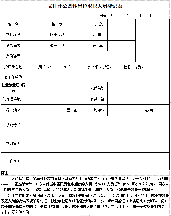 報(bào)名時(shí)應(yīng)提交的材料:公益性崗位求職人員登記表、本人身份證及復(fù)印件、就業(yè)失業(yè)登記(就業(yè)創(chuàng)業(yè)證)原件及復(fù)印件、學(xué)歷證書及復(fù)印件。