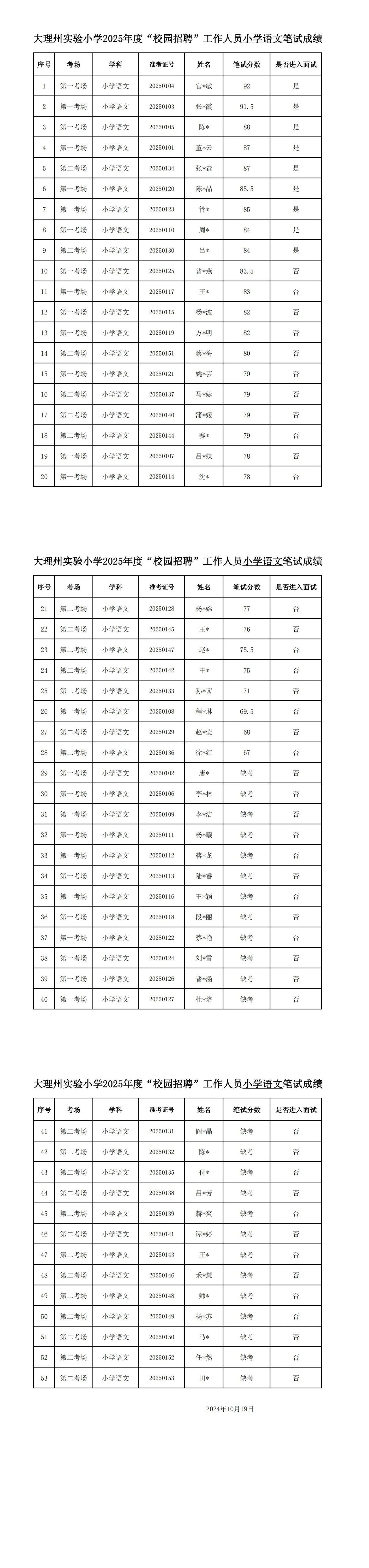 根據(jù)《大理州教育體育系統(tǒng)2025年度“校園招聘”工作人員公告》等有關(guān)規(guī)定,大理州實驗小學于2024年10月19日上午組織2025年度“校園招聘”工作人員筆試考核,現(xiàn)將報考大理州實驗小學考生筆試成績公布如下: