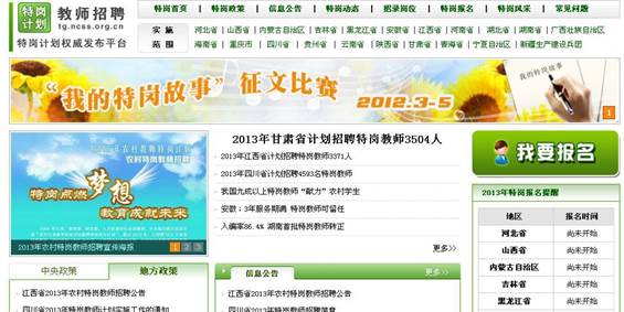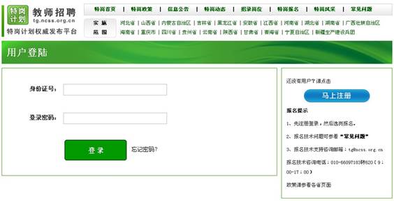 1.考生先登錄特崗網(wǎng)站首頁(yè)(http://tg.ncss.org.cn/),點(diǎn)擊右側(cè)的【我要報(bào)名】即可打開(kāi)網(wǎng)上報(bào)名子系統(tǒng),也可以直接輸入網(wǎng)上報(bào)名子系統(tǒng)的具體網(wǎng)址 http://tg.ncss.org.cn/stu/reg/login,如圖 1 和 2 所示: