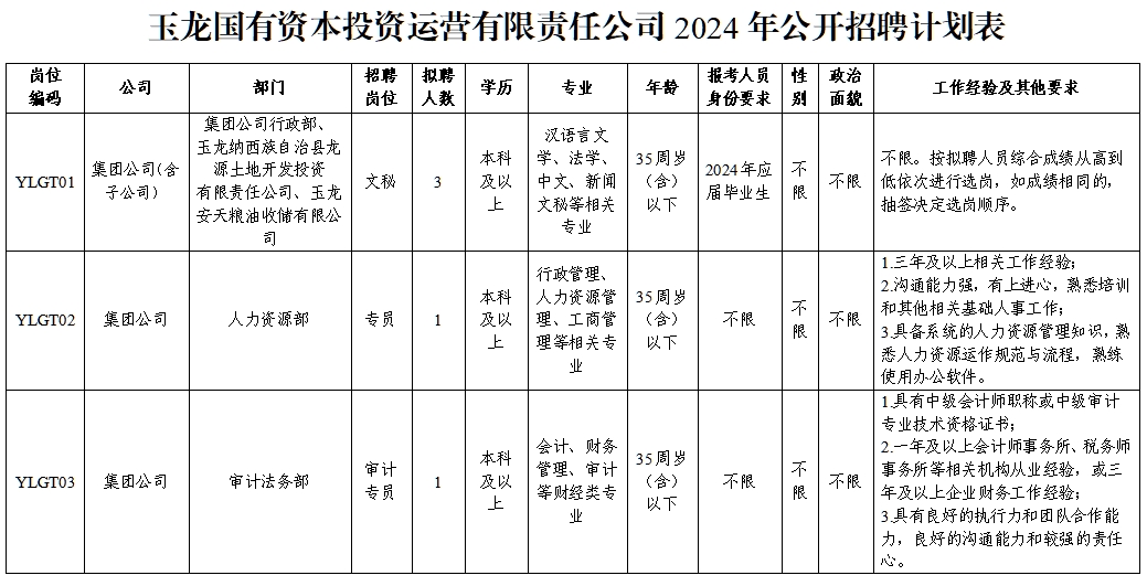 3.崗位所需的專業(yè)和其他條件(詳見附件《玉龍國有資本投資運(yùn)營有限責(zé)任公司2024年公開招聘計(jì)劃表》);