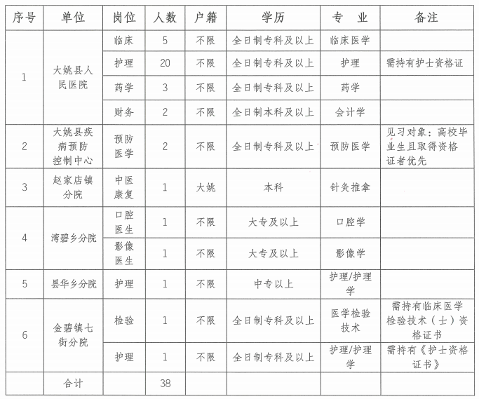 因根據(jù)工作需要,經(jīng)研究,大姚縣緊密型縣域醫(yī)共體總醫(yī)院縣鄉(xiāng)各分院擬招聘就業(yè)見習(xí)人員38名,現(xiàn)將有關(guān)事項公告如下: