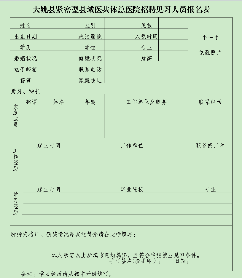 大姚縣醫(yī)共體總醫(yī)院2024年就業(yè)見習(xí)人員招聘報名表