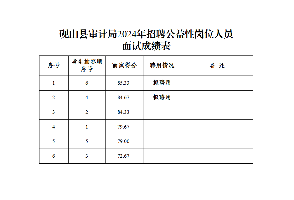 根據(jù)《2024年硯山縣審計(jì)局公開招聘公益性崗位人員公告》要求,現(xiàn)將2024年硯山縣審計(jì)局招聘公益性崗位人員面試成績予以公示(詳見附件),公示期5個(gè)工作日(2024年11月1日—2024年11月7日)。公示期內(nèi)如對面試成績有異議,請于2024年11月7日17:30分之前書面向縣紀(jì)委縣監(jiān)委派駐縣交運(yùn)局紀(jì)檢監(jiān)察組和縣審計(jì)局(雙擁路60號)反饋。逾期反映的,將不再受理。