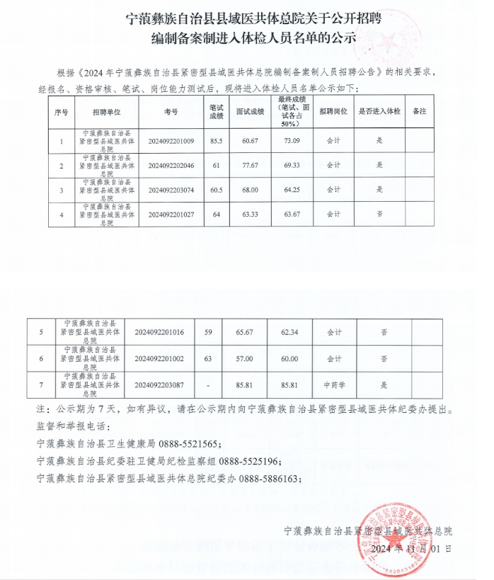 2024年麗江市寧蒗縣縣域醫(yī)共體總院招聘編制備案制進入體檢人員公示