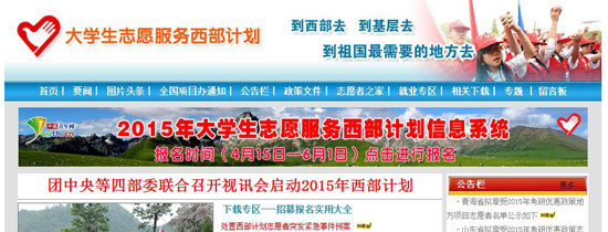 尋找報名入口。在西部計劃網(http://xibu.youth.cn/)導航欄下找到2015年大學生志愿服務西部計劃信息系統(tǒng)報名的通欄入口。(見圖一)