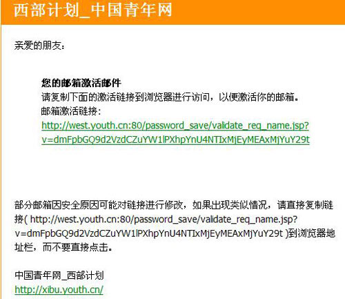 填寫完個人郵箱后,點擊“我要報名”后,頁面會彈出對話框提示(http://west.youth.cn/password_save/send_username4emial.jsp):您的注冊鏈接已經發(fā)到您的郵箱里,請登錄您的郵箱完成注冊?。ㄒ妶D四)