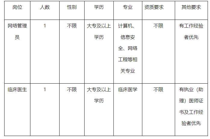 根據(jù)醫(yī)院醫(yī)療業(yè)務(wù)工作需要,賓川縣州城鎮(zhèn)衛(wèi)生院擬面向社會(huì)公開招聘編制外工作人員2名,現(xiàn)將有關(guān)招聘事項(xiàng)公告如下: