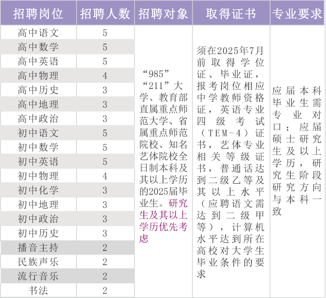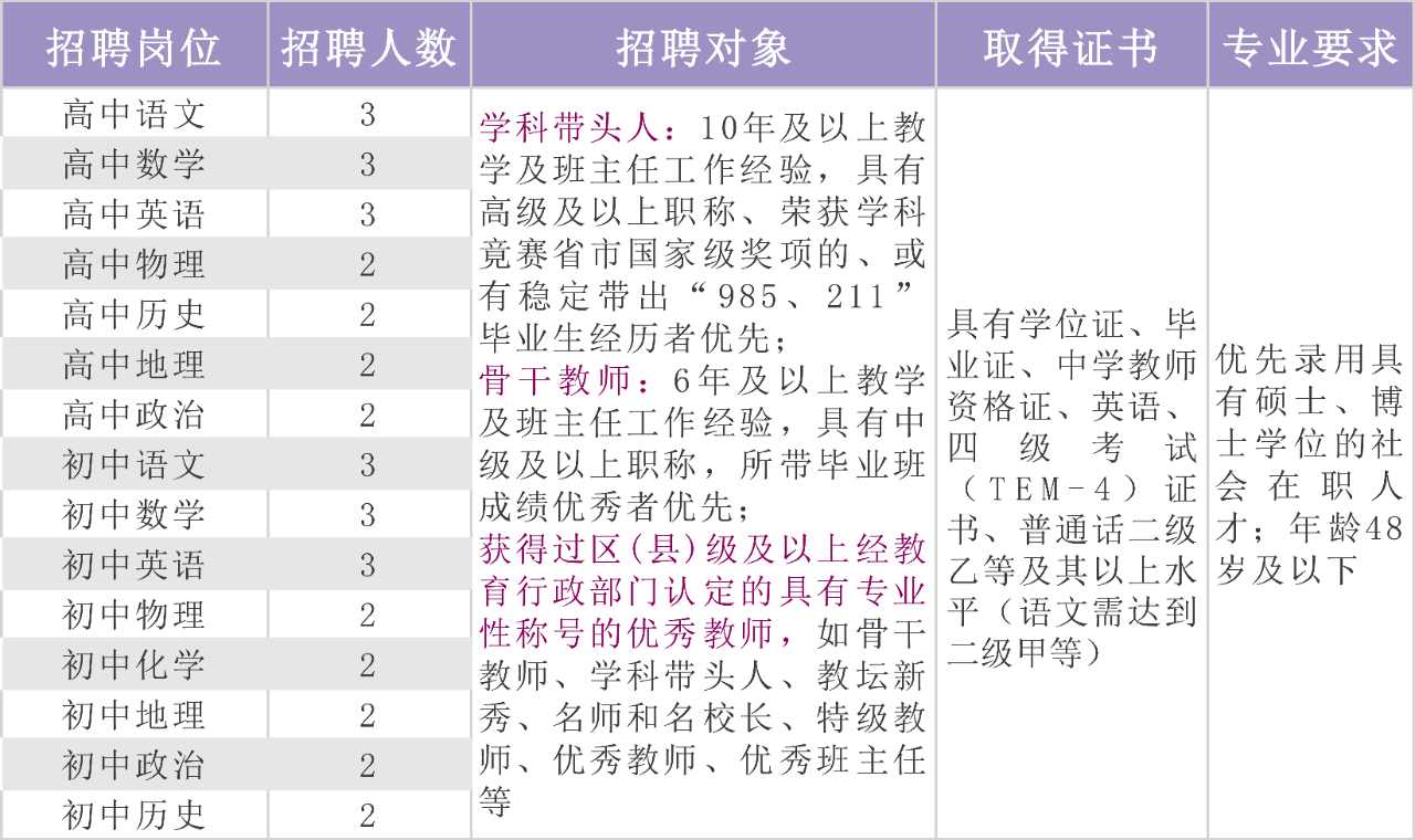 綜合年薪20萬—30萬,以崗定酬,優(yōu)績優(yōu)酬;6年及以上教學(xué)及班主任工作經(jīng)驗,具有中級及以上職稱,所帶畢業(yè)班成績優(yōu)秀者優(yōu)先;優(yōu)先錄用碩士、博士研究生。