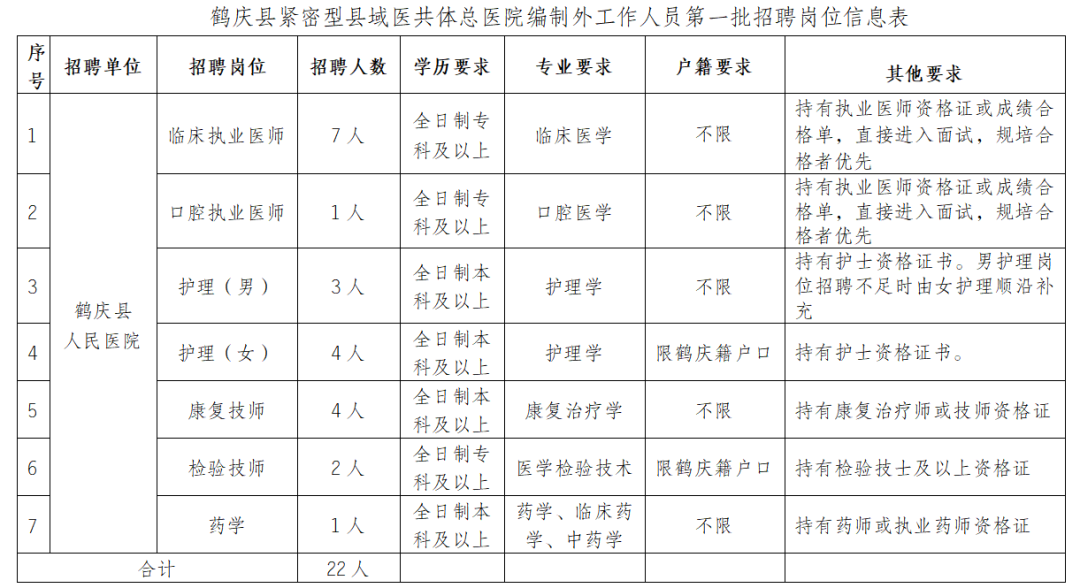 為加強鶴慶縣緊密型縣域醫(yī)共體人才隊伍建設(shè),提升縣域醫(yī)療綜合服務(wù)能力,滿足人民群眾對健康服務(wù)的需求,經(jīng)研究,醫(yī)共體總醫(yī)院(鶴慶縣人民醫(yī)院)決定面向社會公開招聘編外工作人員22名,現(xiàn)將有關(guān)事項公告如下: