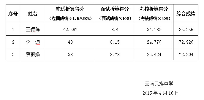 云南民族中學(xué)2015年編外化學(xué)教師招聘綜合成績(jī)公示