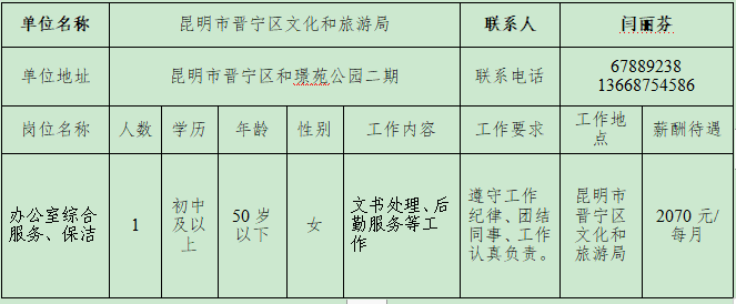 根據(jù)《昆明市人力資源和社會(huì)保障局昆明市財(cái)政局 關(guān)于做好公益性崗位開發(fā)管理有關(guān)工作的通知》(昆人社通〔2020〕37號(hào))精神,按照公開、公平、公正的原則,為做好晉寧區(qū)城鎮(zhèn)公益性崗位開發(fā)管理工作,現(xiàn)將2024年公益性崗位招聘公示如下:
