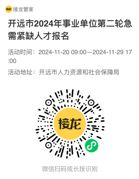3.報名方式:本次實行網(wǎng)絡(luò)報名,應(yīng)聘人員掃描下方二維碼進(jìn)行報名,到報名截止時間未完成報名步驟和提供相應(yīng)材料的,視為放棄報名資格,報名過程中如遇到問題可聯(lián)系開遠(yuǎn)市人力資源和社會保障局事業(yè)單位管理科,聯(lián)系電話:0873-7236881,郵箱:kyrsjsyk@163.com。