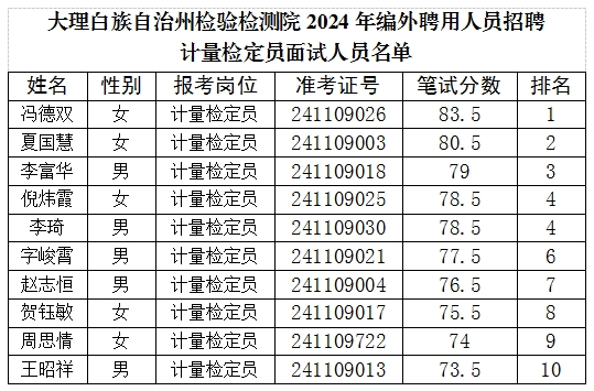 5.面試結(jié)束后,按照面試成績從高到低的順序與崗位招聘人數(shù)等額確定公示人員。公示人員作為擬聘用人員,在“大理檢驗(yàn)檢測”微信公眾號公示5個工作日。