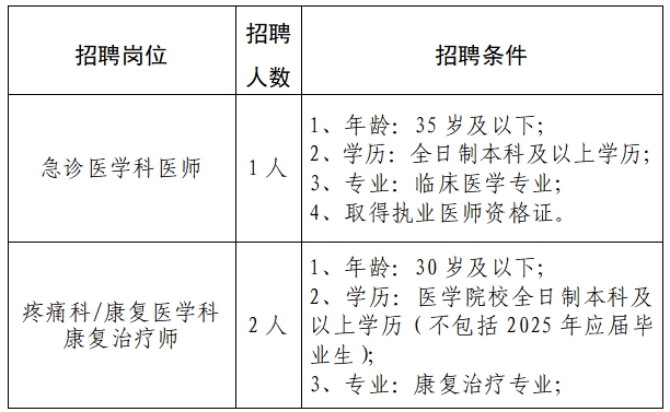 根據(jù)醫(yī)院業(yè)務(wù)發(fā)展需求,現(xiàn)需招聘急診醫(yī)學(xué)科編外醫(yī)生和疼痛/康復(fù)醫(yī)學(xué)科康復(fù)治療師共3人,具體招聘條件如下: