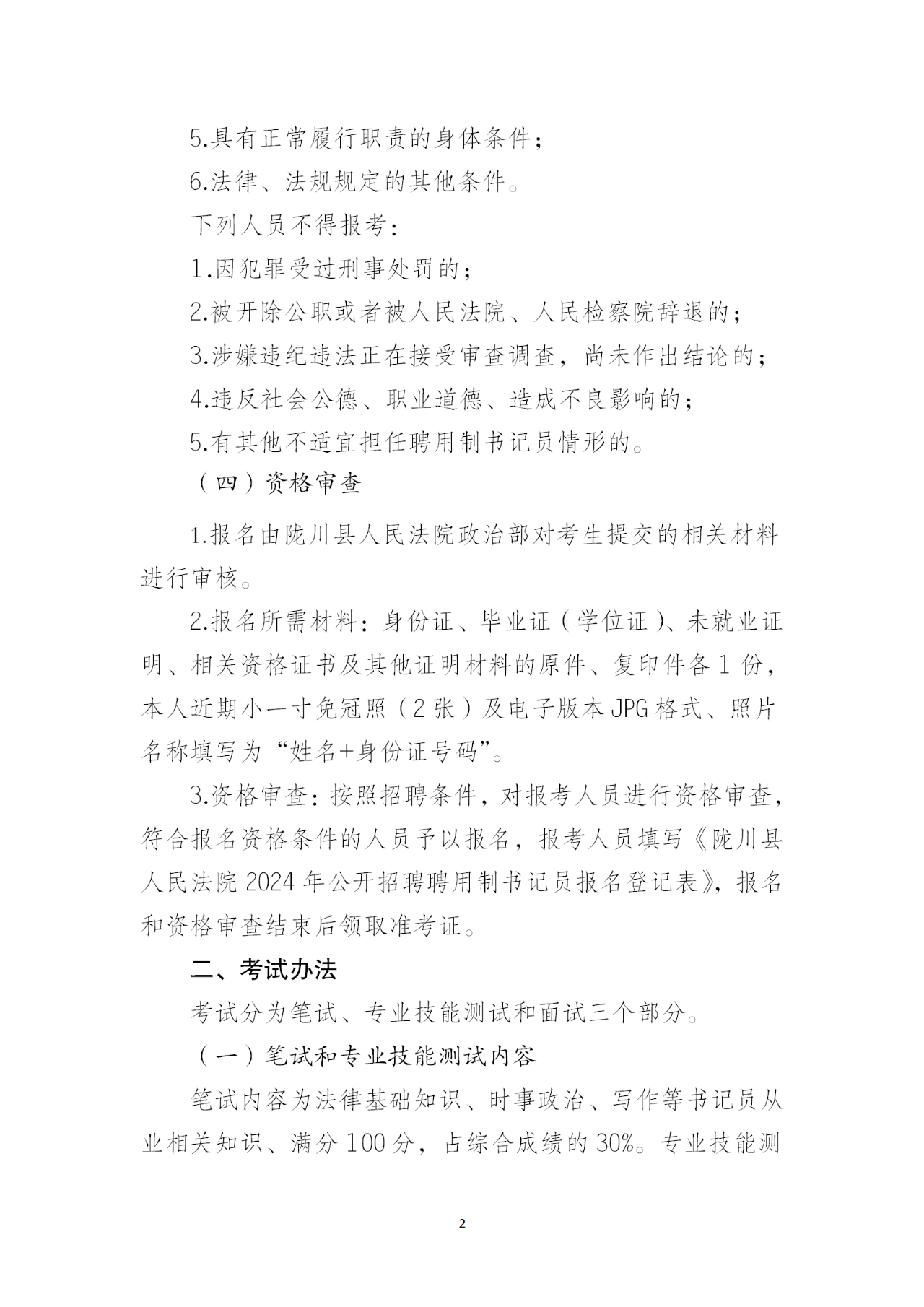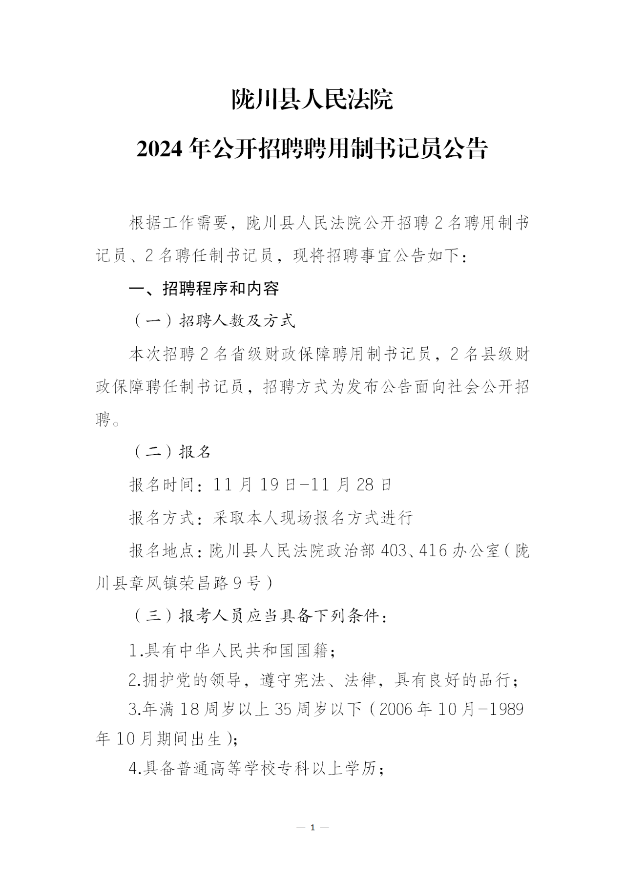 隴川縣人民法院2024年公開招聘聘用制書記員公告