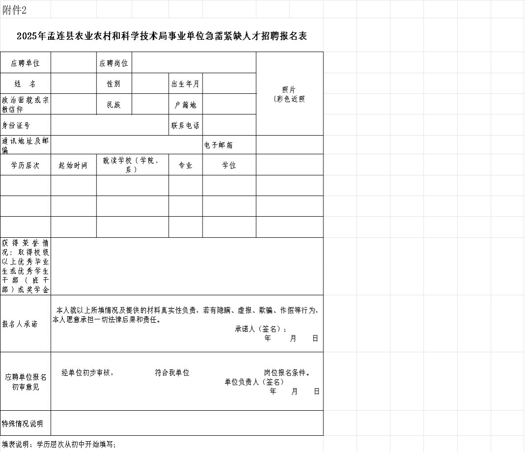 2.2025年孟連縣農(nóng)業(yè)農(nóng)村和科學(xué)技術(shù)局事業(yè)單位急需緊缺人才招聘報(bào)名表