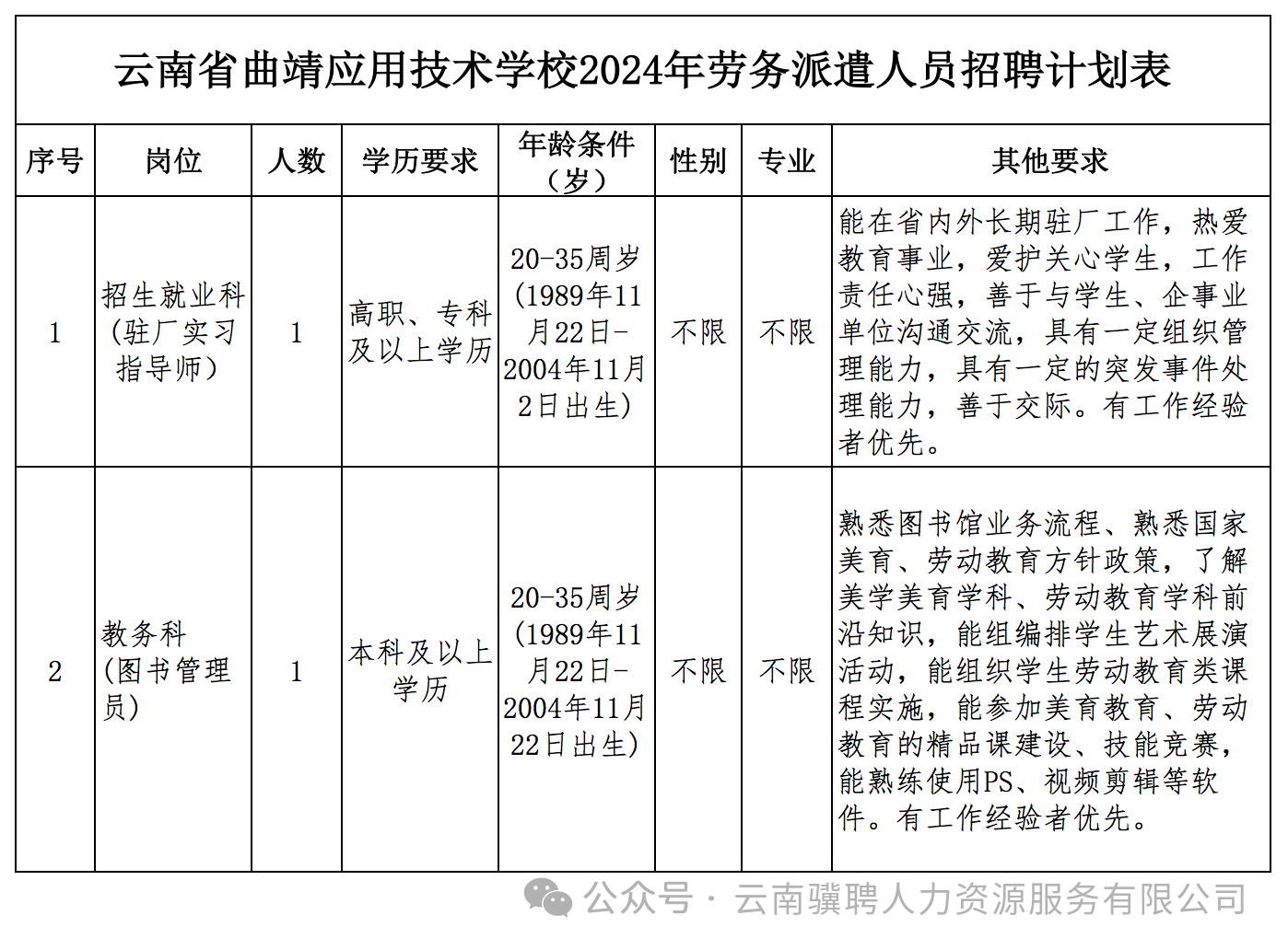 云南驥聘人力資源服務(wù)有限公司受云南省曲靖應(yīng)用技術(shù)學(xué)校委托,面向社會公開招聘勞務(wù)派遣人員2名。公司將按照勞務(wù)派遣的相關(guān)規(guī)定,結(jié)合用人單位工作實際要求,嚴(yán)格遵循“公開、平等、競爭、擇優(yōu)”的原則,嚴(yán)格考核、擇優(yōu)聘用,現(xiàn)將有關(guān)事項公告如下: