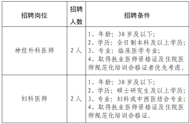 根據(jù)醫(yī)院業(yè)務(wù)發(fā)展需求,現(xiàn)需招聘神經(jīng)外科、婦科編外醫(yī)生4人,具體招聘條件如下: