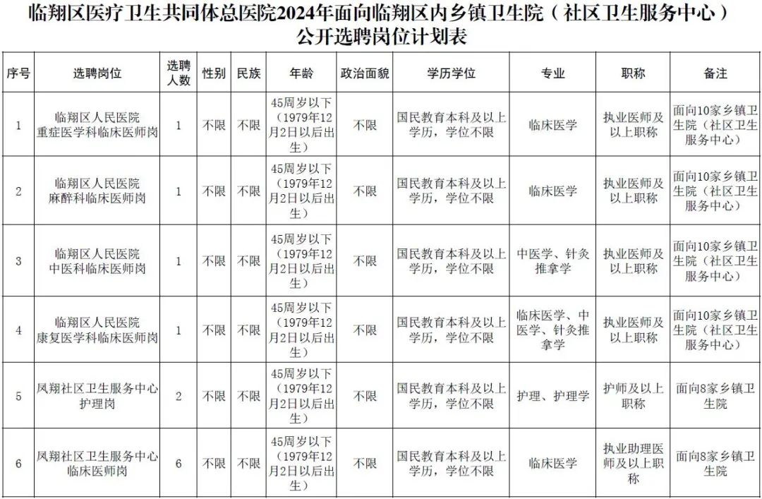 (十一)除上述基本條件外,各公開選聘崗位要求詳見《臨翔區(qū)醫(yī)療衛(wèi)生共同體總醫(yī)院2024年面向臨翔區(qū)內(nèi)鄉(xiāng)鎮(zhèn)衛(wèi)生院(社區(qū)衛(wèi)生服務(wù)中心)公開選聘崗位計(jì)劃表》。