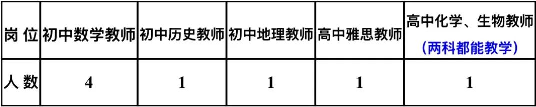 (2)化學、生物教師要求:大學本科或以上,扎實的化學、生物專業(yè)功底,大學期間成績優(yōu)秀;大學英語六級以上,雅思6.5分以上或同等條件者優(yōu)先;擁有至少三年或以上的高中化學、生物教學經(jīng)驗,有國際課程教學經(jīng)驗者優(yōu)先。高中化學或生物教師資格證(必備);能夠虛心聽取不同的意見,嚴于律己,對教學有鉆研精神,對教育有使命感;有海外留學背景者優(yōu)先。
