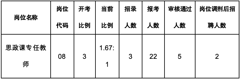 二、審核通過(guò)人數(shù)與招聘人數(shù)比例達(dá)不到3:1,經(jīng)研究,結(jié)合學(xué)院思政課專(zhuān)任教師崗位招聘工作實(shí)際,將計(jì)劃招聘人數(shù)由3人調(diào)減為2人并放寬開(kāi)考比例開(kāi)考的崗位1個(gè)