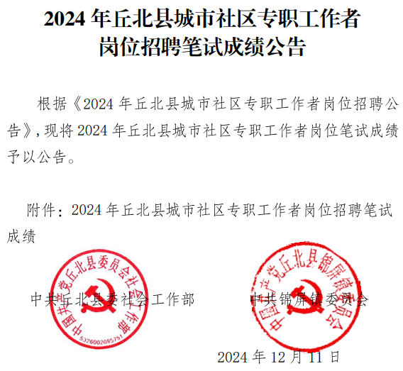 2024年丘北縣城市社區(qū)專職工作者崗位招聘筆試成績(jī)公告