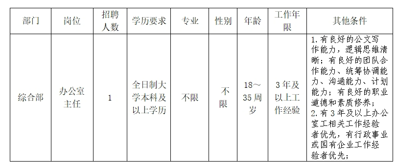 為加強人才隊伍建設(shè),優(yōu)化專技人員結(jié)構(gòu),結(jié)合公司工作實際,計劃公開招聘辦公室主任一職,為確保公開招聘工作順利進行,現(xiàn)將有關(guān)事項公告如下: