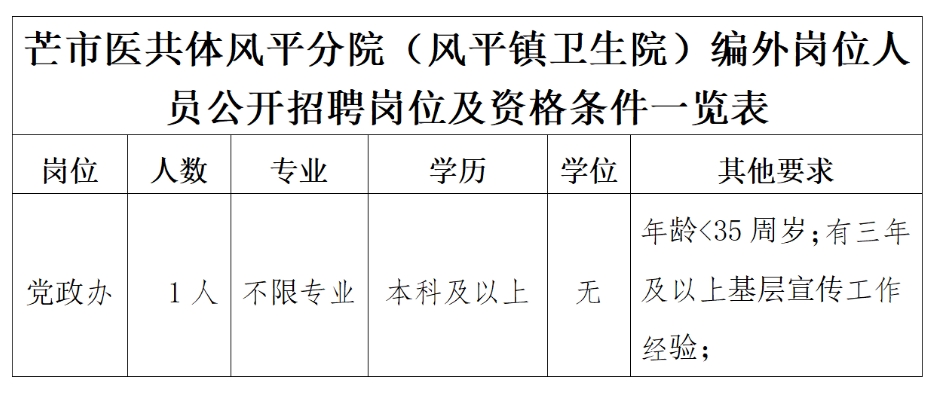 芒市緊密型縣域醫(yī)共體風(fēng)平鎮(zhèn)分院(風(fēng)平鎮(zhèn)衛(wèi)生院)因業(yè)務(wù)發(fā)展需求,現(xiàn)面向社會(huì)公開(kāi)招聘編制外工作人員1名。具體通告如下: