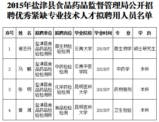 2015年昭通市鹽津縣食藥監(jiān)局公開招聘技術(shù)人才擬聘用名單公示