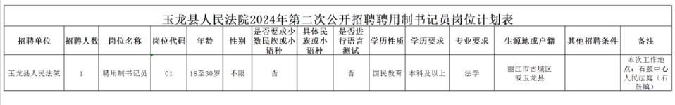 招聘計劃詳見《玉龍縣人民法院2024年第二次公開招聘聘用制書記員崗位計劃表》(以下簡稱《計劃表》)。