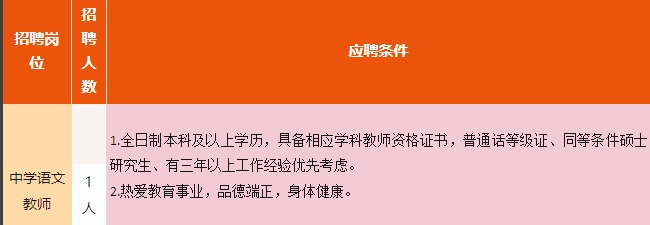 1.全日制本科及以上學(xué)歷,具備相應(yīng)學(xué)科教師資格證書,普通話等級(jí)證、同等條件碩士研究生、有三年以上工作經(jīng)驗(yàn)優(yōu)先考慮。