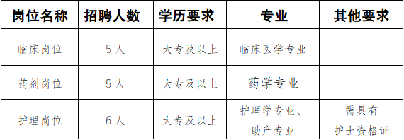 招募16名青年就業(yè)見習(xí)人員,其中臨床醫(yī)生崗位5人,藥學(xué)崗位5人,護(hù)理崗位6人。具體見下表: