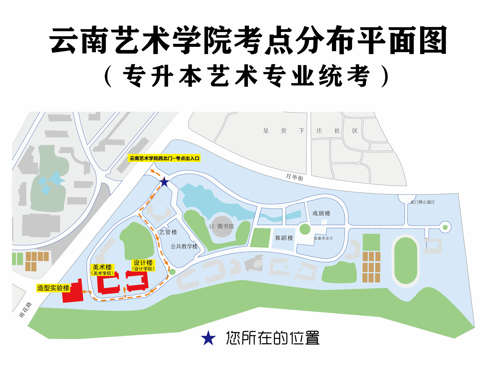 (三)考試前不安排考生查看考場,請考生提前熟悉云南藝術(shù)學(xué)院考點位置,規(guī)劃好赴考路線,注意出行安全。所有考生統(tǒng)一由云南藝術(shù)學(xué)院呈貢校區(qū)西北門入校,除考生本人外,其他送考人員及車輛不得進入校園。