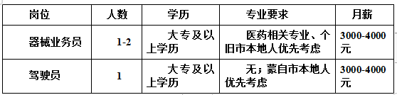 工作地址:駕駛員工作地點(diǎn):蒙自市;器械業(yè)務(wù)員工作地點(diǎn):個(gè)舊。