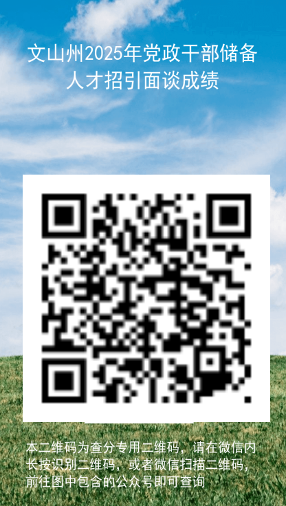 文山州2025年黨政干部儲備人才招引面談成績通告 根據(jù)《云南省文山州2025年黨政干部儲備人才招引通告》有關(guān)精神,近日,由州委組織部牽頭,6個縣(市)黨委組織部和7個州直部門已完成文山州2025年黨政干部儲備人才招引網(wǎng)絡(luò)面談工作,現(xiàn)將各崗位面談成績通告如下: (請掃描下方二維碼進(jìn)行查看)