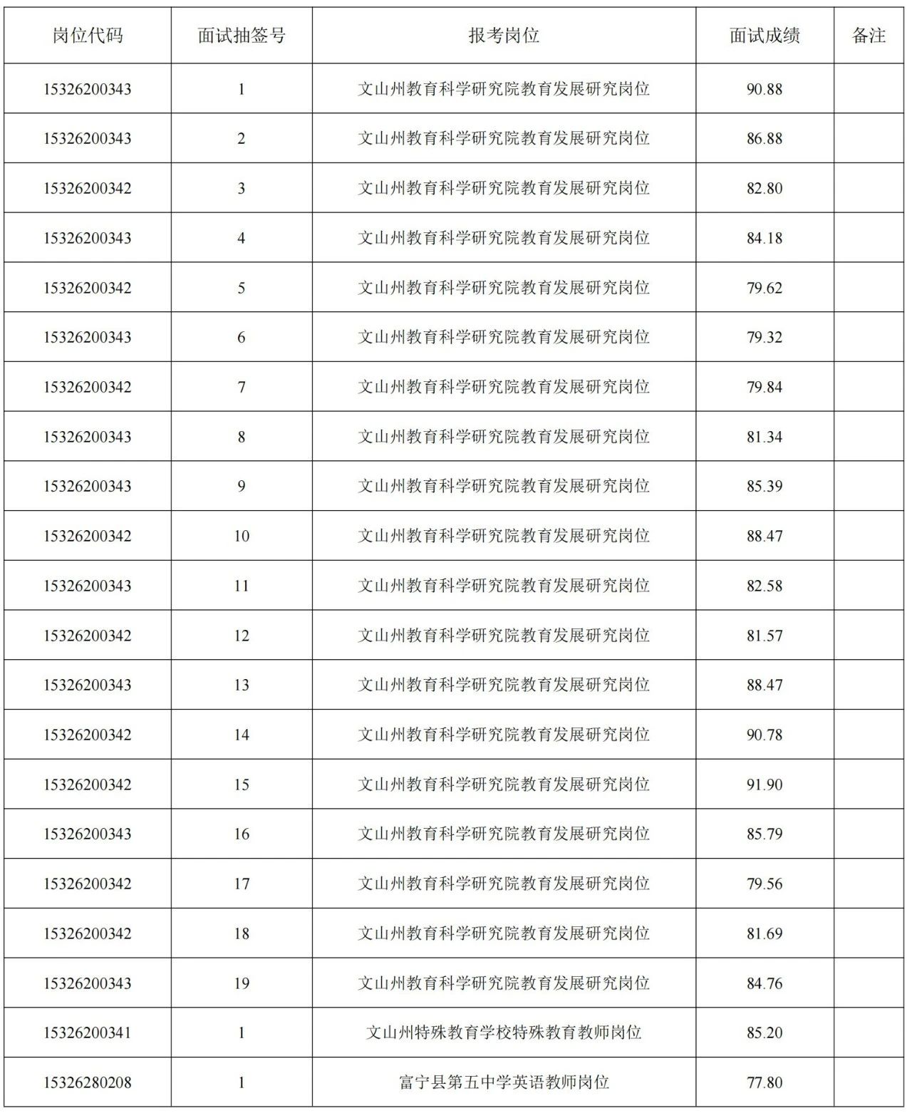 根據(jù)《2025年文山州事業(yè)單位緊缺崗位招聘通告》規(guī)定的程序和要求,文山州教育體育局于2024年12月21日至12月22日對(duì)符合崗位條件人員進(jìn)行了面試,現(xiàn)將面試成績(jī)公布如下: