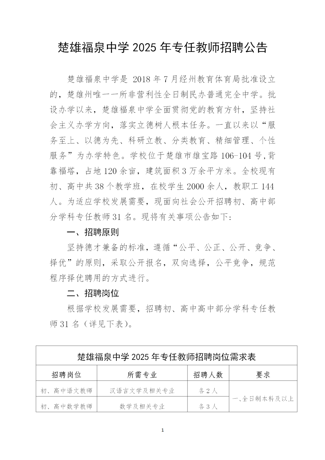 2025年楚雄福泉中學(xué)專(zhuān)任教師招聘公告