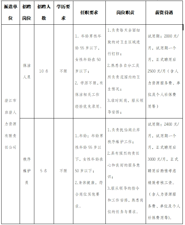 因工作需要,澄江市啟澄人力資源有限責(zé)任公司現(xiàn)面向社會公開招聘勞務(wù)派遣人員15名,現(xiàn)將有關(guān)事項(xiàng)公告如下: