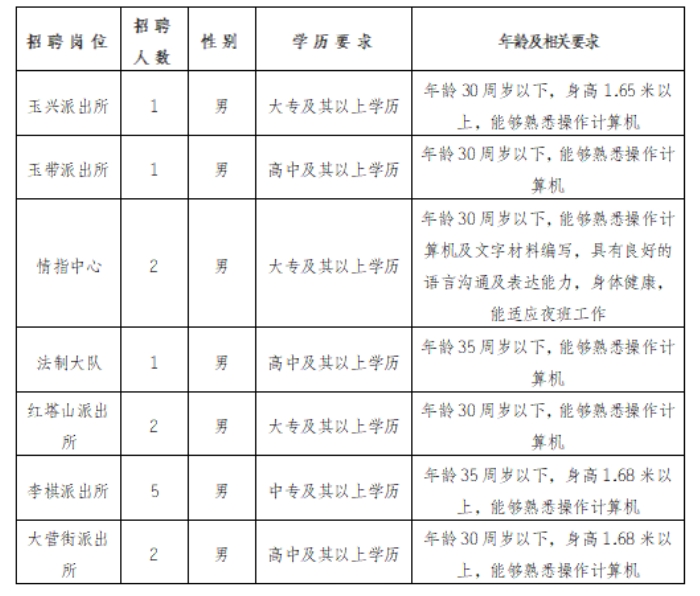 7.同等條件下,優(yōu)先招聘公安烈士和因公犧牲公安民警和警務(wù)輔助人員的配偶子女、退役軍人,見義勇為積極分子和先進(jìn)個(gè)人、警察類或政法院校畢業(yè)生,持有駕駛證B照的男性以及具有專業(yè)資質(zhì)或?qū)iT技能的人員。