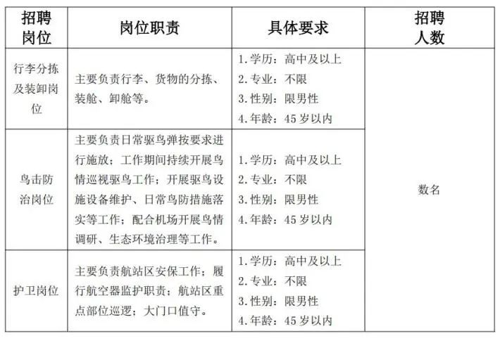 根據(jù)工作需要,公司決定面向社會(huì)公開(kāi)招聘迪慶香格里拉機(jī)場(chǎng)網(wǎng)點(diǎn)行李分揀及裝卸員、護(hù)衛(wèi)員、鳥(niǎo)擊防治員等?,F(xiàn)將招聘內(nèi)容公告如下: