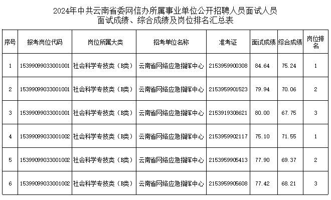 2024年中共云南省委網(wǎng)信辦所屬事業(yè)單位公開招聘人員面試成績、綜合成績及崗位排名公告