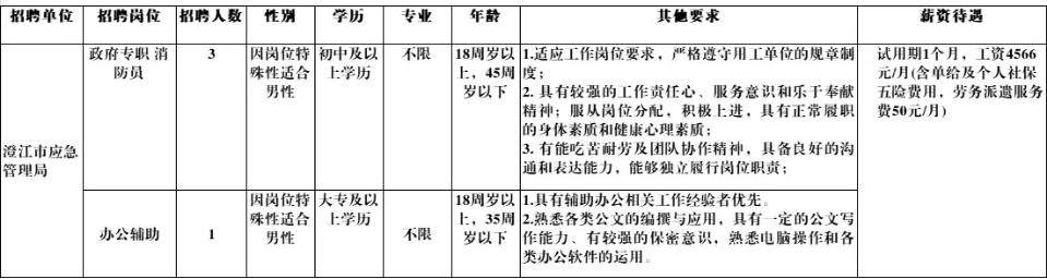 澄江市應(yīng)急管理局因工作需要,委托澄江市啟澄人力資源有限責(zé)任公司面向社會(huì)公開(kāi)招聘政府專(zhuān)職消防員4人,招聘相關(guān)事項(xiàng)如下: