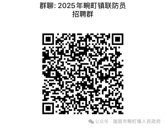 4.報名人員需掃描招聘公告上的“2025年畹町鎮(zhèn)聯(lián)防員招聘群”微信二維碼進群,后續(xù)招聘過程中通過微信群或微信公眾號“瑞麗市畹町鎮(zhèn)人民政府”發(fā)布招聘相關(guān)事項。(招聘群二維碼附文末)