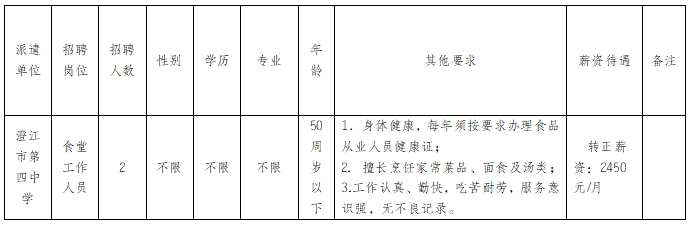 澄江市第四中學因工作需要,委托澄江市啟澄人力資源有限責任公司,面向社會公開招聘食堂工作人員2人,現(xiàn)將有關事項公告如下: